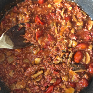 Aggiungere i pelati e lasciare andare a fuoco lento almeno 40 minuti con un coperchio(più il sugo è sul fuoco più si insaporisce). Quando l’acqua del pomodoro si è ritirata spegnere il fuoco e lasciar riposare.